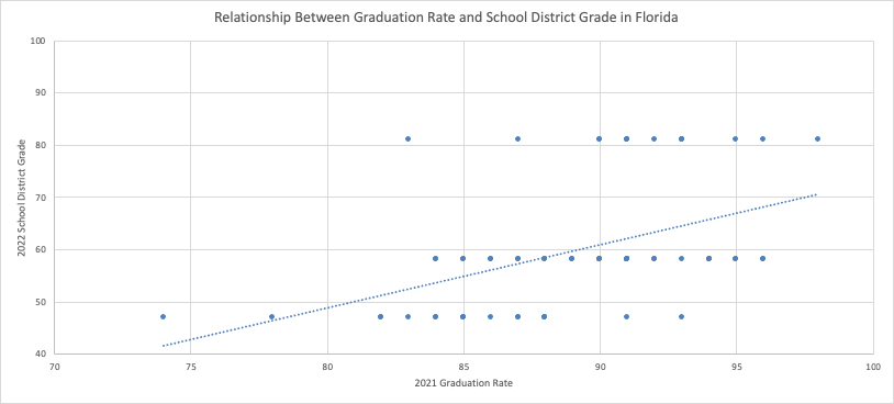 The following figures and tables were created from the data to present answers to the research questions and answer the hypotheses. First, let’s examine research question 1: Is there a relationship between district grade and graduation rate among Floridian public school districts?