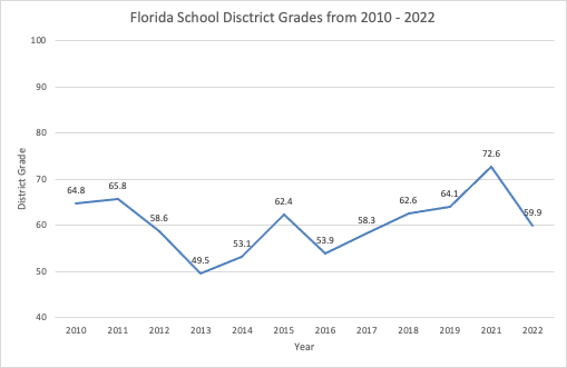 This brief examination of the recent academic results from the state of Florida explored the following research questions: 1) Is there a relationship between district grade and graduation rate among Floridian public school districts? In this case, the independent variable was DG and the dependent variable was 2021 GR. 2) How have district grades changed from 2010 – 2022 among Floridian public school districts? This project used the following hypotheses: 1) There is a relationship between district grade and graduation rate among Floridian public school districts. 2) District grades in Floridian public school districts increased from 2010 – 2019, then decreased from 2020 – 2022 due to factors surrounding the COVID-19 pandemic.