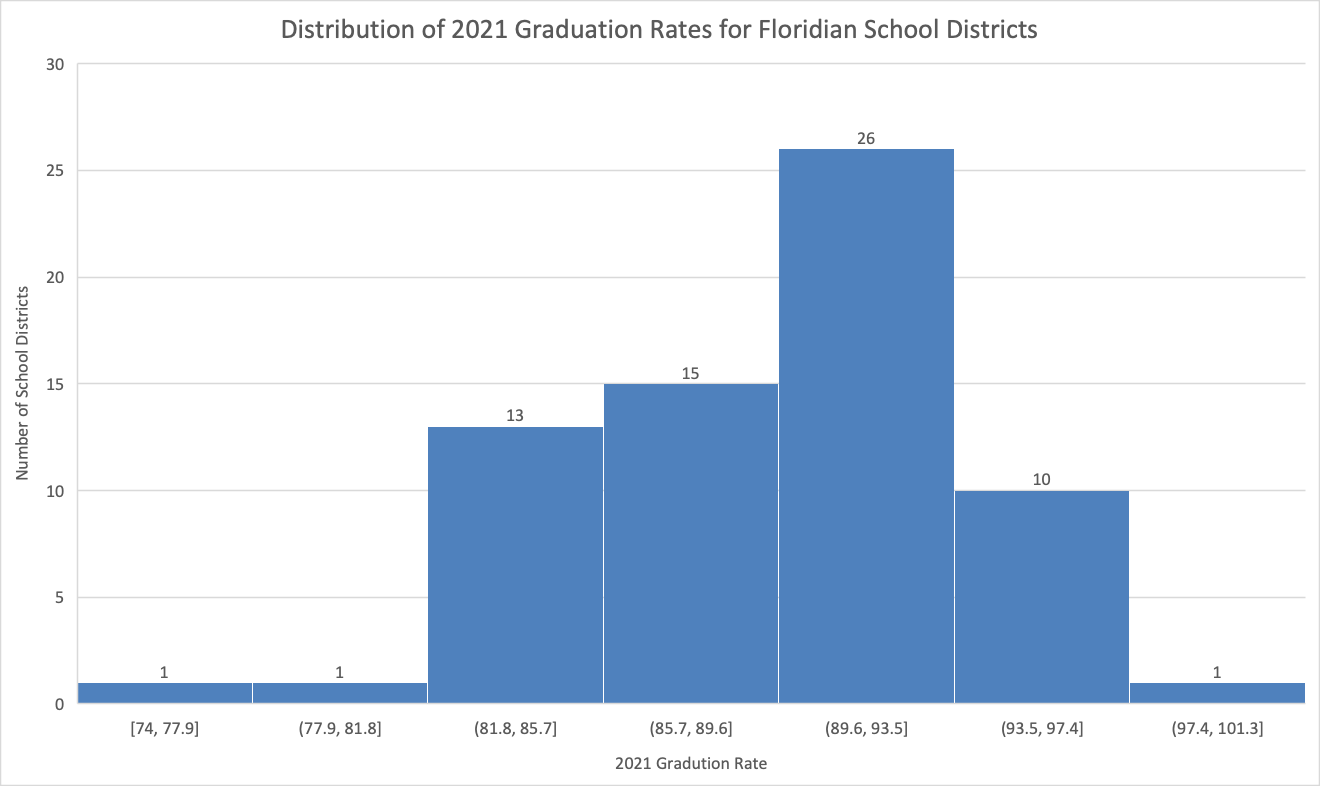 Figure 3 displays the distribution of 2021 GR among FSDs. The most common distribution range is from 89.6% – 93.5% GR, with 26 school districts falling within this range. This figure is a helpful visual to represent one of the most valuable culminating metrics of any public school system, their ability to graduate students.