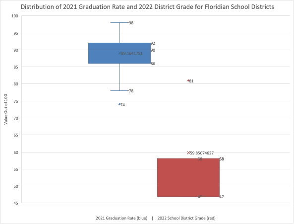 Figure 2 shows an additional way to examine the relationship between the 2021 GR and 2022 DG. This box and whisker chart shows the distribution, mean, and outliers of both values. Although both GR and DG are on a 100-point scale, one is a percentage, the other is the median score on a letter grade scale (as mentioned in the Methods section). GR is a statistic that the FDOE is incentivised to have as high as possible. While DG is an accountability metric used to improve schools. Thus, the comparison between GR and DG is not direct. In the end, Figure 2 is less of a relationship graph and more of a side-by-side comparison between two potentially connected values.